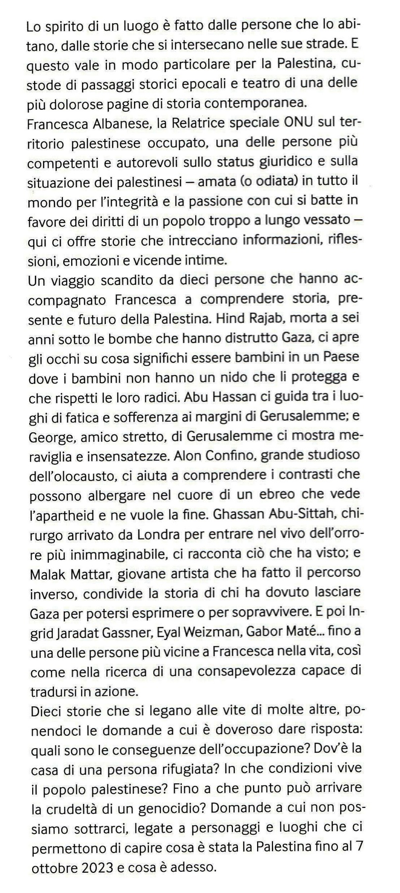 "Gli ulivi occupano un posto speciale nel cuore di ogni palestinese. Non solo costituiscono un’ancora di salvezza economica per le oltre 80.000 famiglie che li coltivano nella sola Cisgiordania, ma rappresentano anche il simbolo della fermezza e della resistenza politica, poiché gli ulivi , vecchi di migliaia di anni, collegano la nostra gente alla loro terra in uno dei più grandi e più bei esempi viventi dell’identità e del patrimonio culturale palestinese. Nella regione MENA la coltivazione dell’olivo risale a quasi 6.000 anni fa e, naturalmente, i prodotti a base di olive sono anche un ingrediente chiave della cucina palestinese." Amira Gabarin